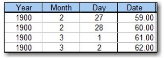 There are two things to observe. First, March 1 and March 2 are 61 and 62 respectively, which align exactly with the results from Excel. Second, there is (correctly) no Feb. 29 in 1900. This means all the days after Feb. 28, 1900 have the same serial number in Excel and MetrixND.